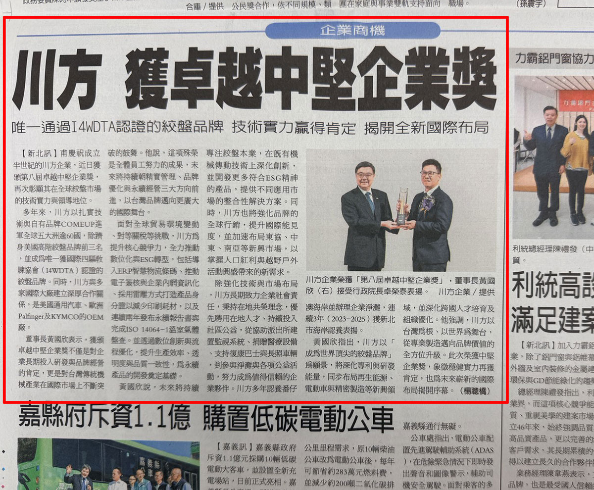 川方企業榮獲第8屆卓越中堅企業獎 - 以技術實力與全球布局展現台灣品牌競爭力